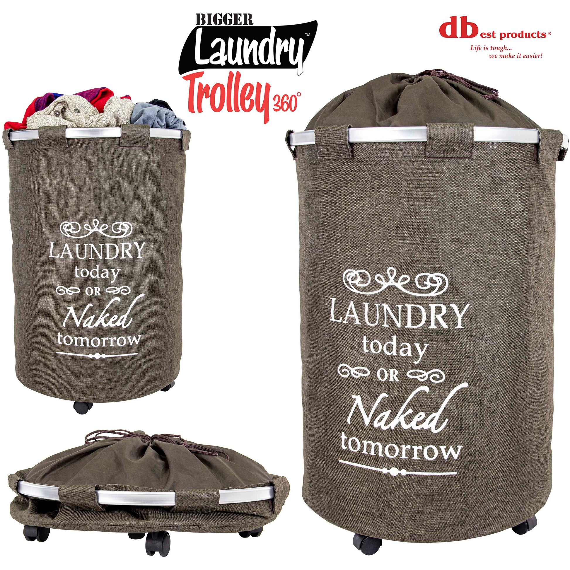 The Bigger Laundry Trolley 360 is the newest laundry cart brought to you by dbest products makers of the Trolley Dolly, the Smart Cart , the Gocart and the Quik Cart. Laundry Trolley 360 is a rolling Laundry Hamper with durable non-slip swivel wheels that has 360 movement for easy maneuverability. Contains removable machine-washable liner to keep your Laundry sorter clean and odorless at all times. Include an aluminum ring and support poles give this Laundry Hamper on wheels structure.