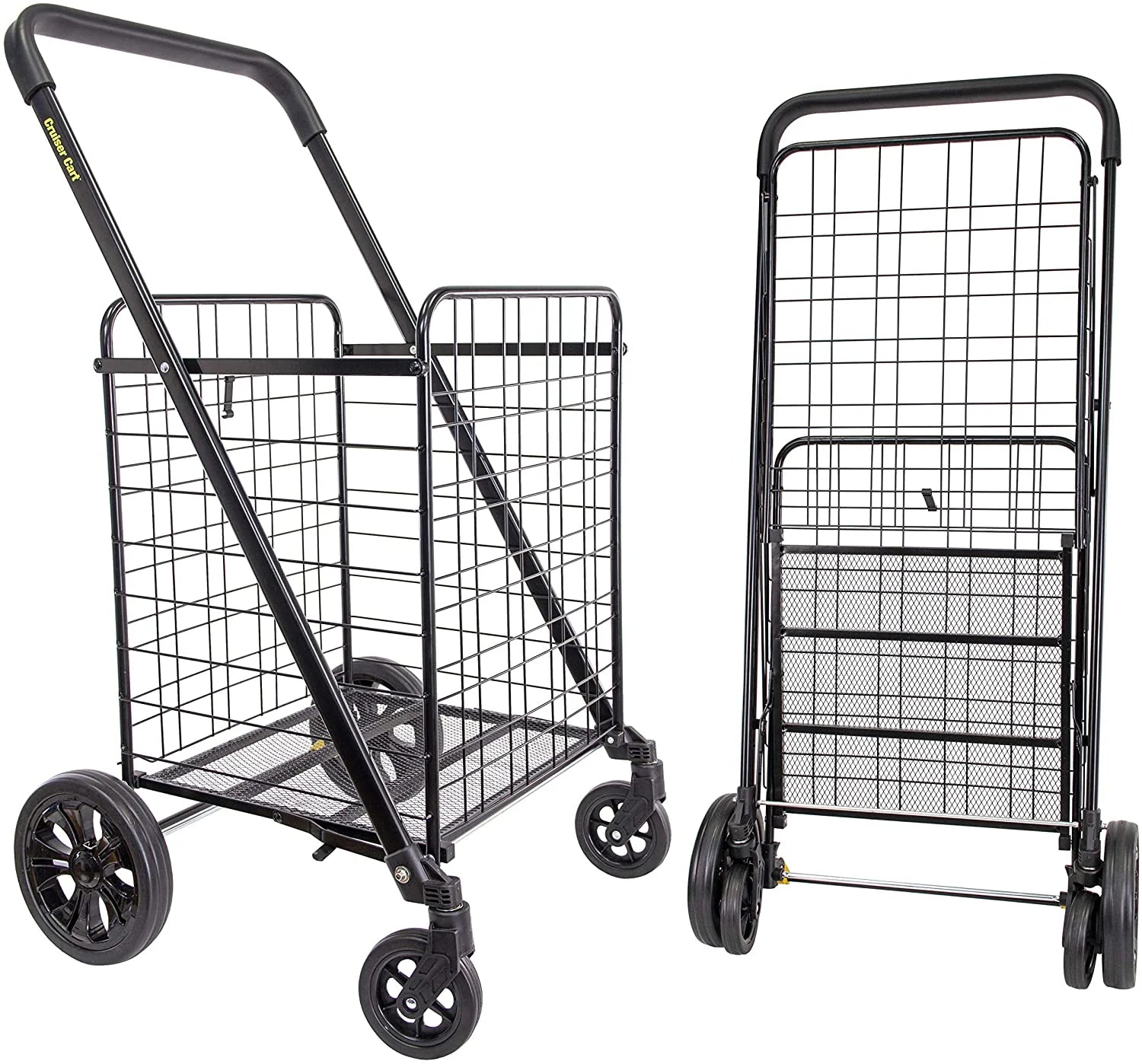An upgraded folding shopping cart with swivel wheels