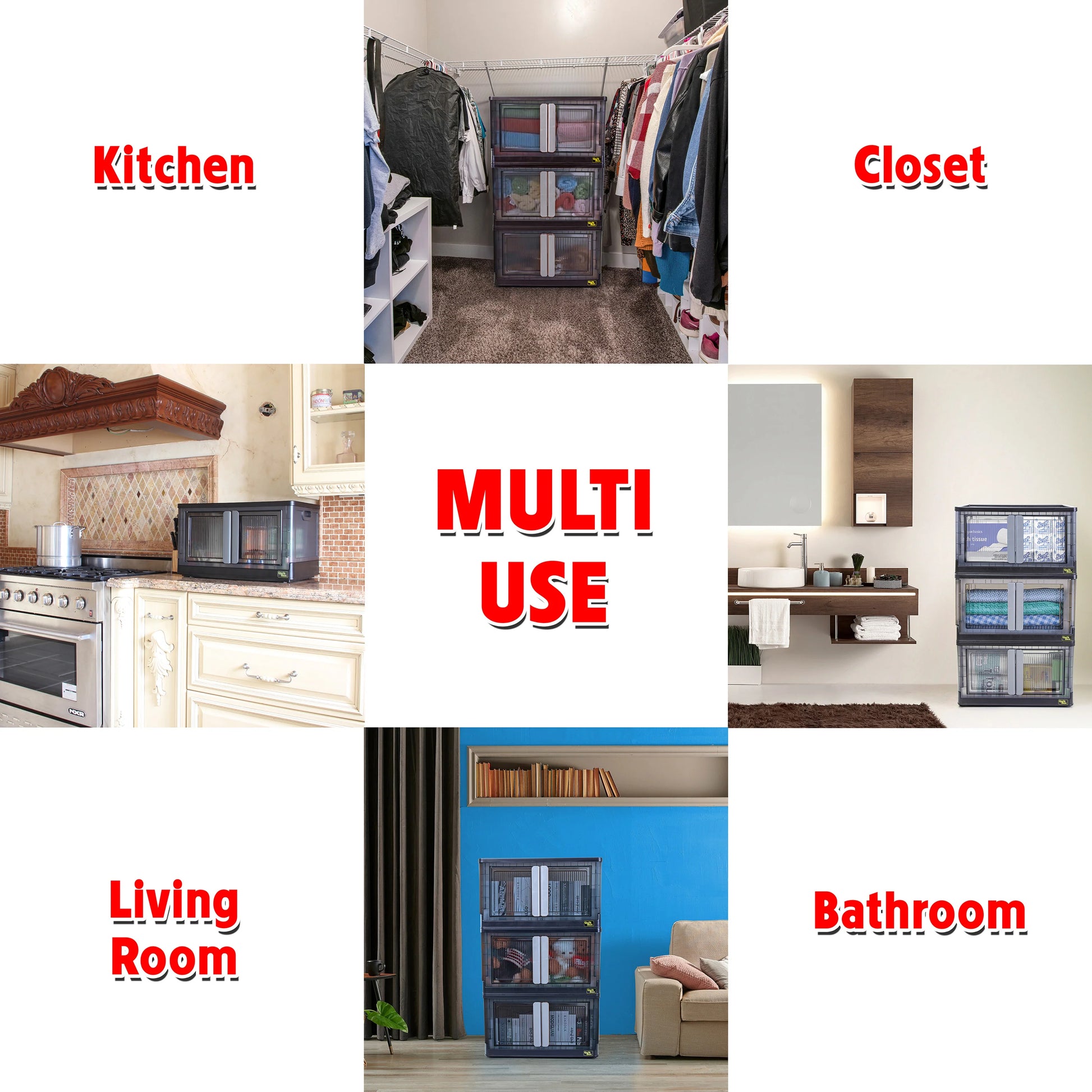 dbest products Quik Box - 19 Gallon 3 pack Stackable Storage Bins with Doors, Collapsible Organizer Foldable Container, for Bedroom Living Room Kitchen Neat, Tidy Dorms and Organized Homes, Boxes Black