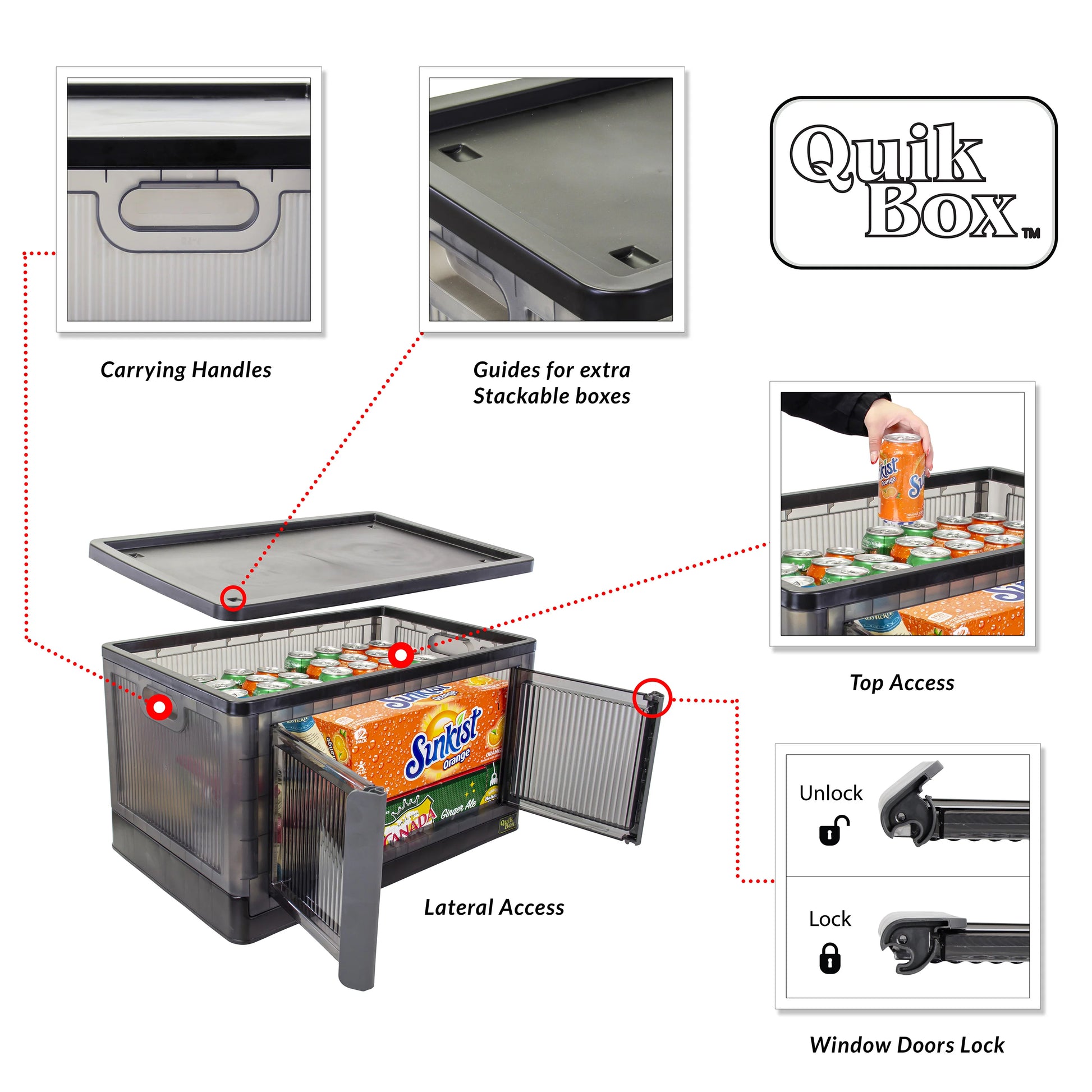 "Hey there, neat freaks and organization nuts! Meet the Quik Box, your new best friend in all things storage. This ain't your run-of-the-mill storage bin. It's a 19-gallon collapsible, stackable, and movable powerhouse. Made of durable plastic, the Quik Box is a foldable container that can be effortlessly collapsed when not in use. The main feature? Two front doors for easy access, even when stacked. Yep, you heard that right. These are stacking crates with doors! But we didn't stop there! We added wheels for easy mobility, and lids to keep your belongings safe. You could say these are the most versatile of Collapsible storage bins with doors. And did we mention they're stackable? These aren't just any ordinary stackable storage bins with doors. They're ideal for dorm storage, making them a must-have for college students. The Quik Box easily fits all your room essentials, functioning as a collapsible craft closet storage and even a camping storage cabinet. Whether you're looking to stow away toys, crafting supplies, clothes, food, bathroom supplies or any other items, these large collapsible storage bins got you covered. They're also great for bedroom organization, closet organizers, and storage shelves for clothes. So, why stick with boring storage options when you could have a Quik Box? Get ready to revolutionize the way you store and organize your stuff. Say goodbye to clutter and hello to a tidier, neater space with Quik Box, your ultimate storage solution. And remember, good things come in stackable, collapsible packages!"