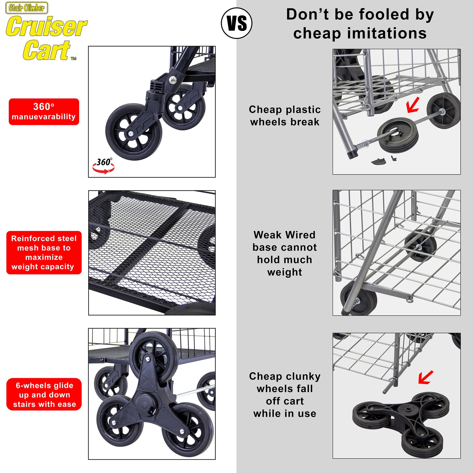 - Glide up and down stairs with ease with 6 wheels. Includes Swivel wheels in the front for 360 degree mobility.