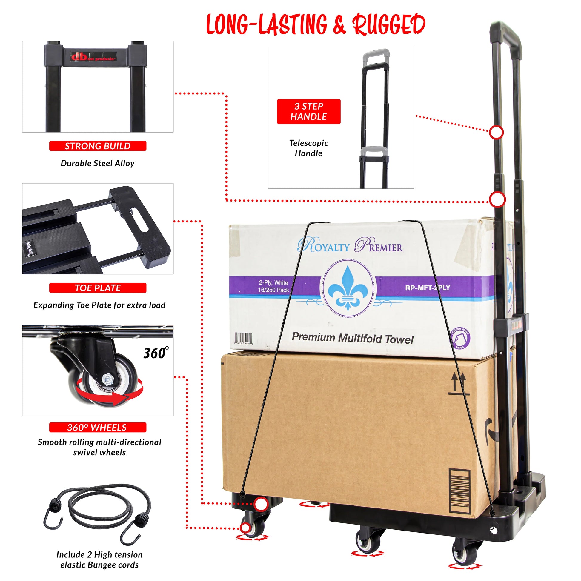 - Telescoping Handle & Expandable Toe Plate: This portable dolly folding cart lightweight features a 3-step telescoping handle for easy maneuverability, and an expandable toe plate for added space to place bulky objects.