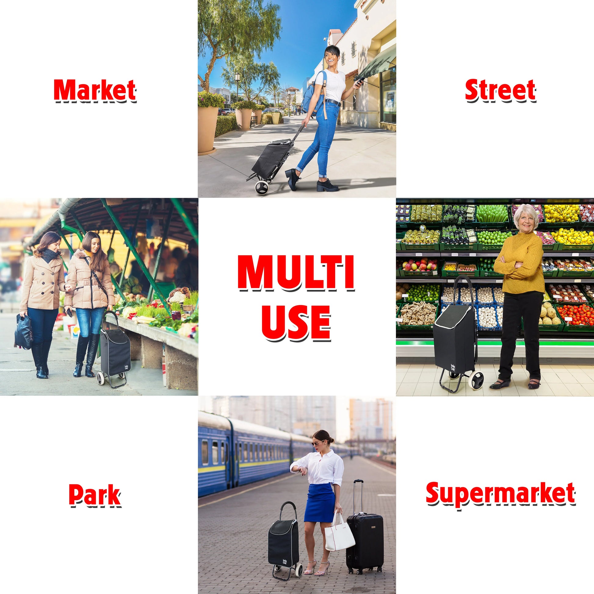 The folding Trolley dolly folds in 1/2 for compact storage. It has a comfort cushion handle that allows you to pull it anywhere. The folding Trolley dolly is designed with 7 compartments/pockets including a beverage holder. The oversized beefy wheels allow for smooth rolling on any surface including cobblestones, sand, stairs or any uneven surfaces. Carry everything from utilities, small groceries, and laundry with this lightweight wheeled push handcart.The weatherproof material of the trolley bags keep contents dry from the rain, snow and the other forces of nature;Take it to the supermarket, at the park for a picnic or for a day the beach; Climb broken and high curbs and sidewalks with ease.Also includes soft ergonomic cushion handle which reduces the stress on the hands; Ideal for mobile seniors or shoppers without vehicles.