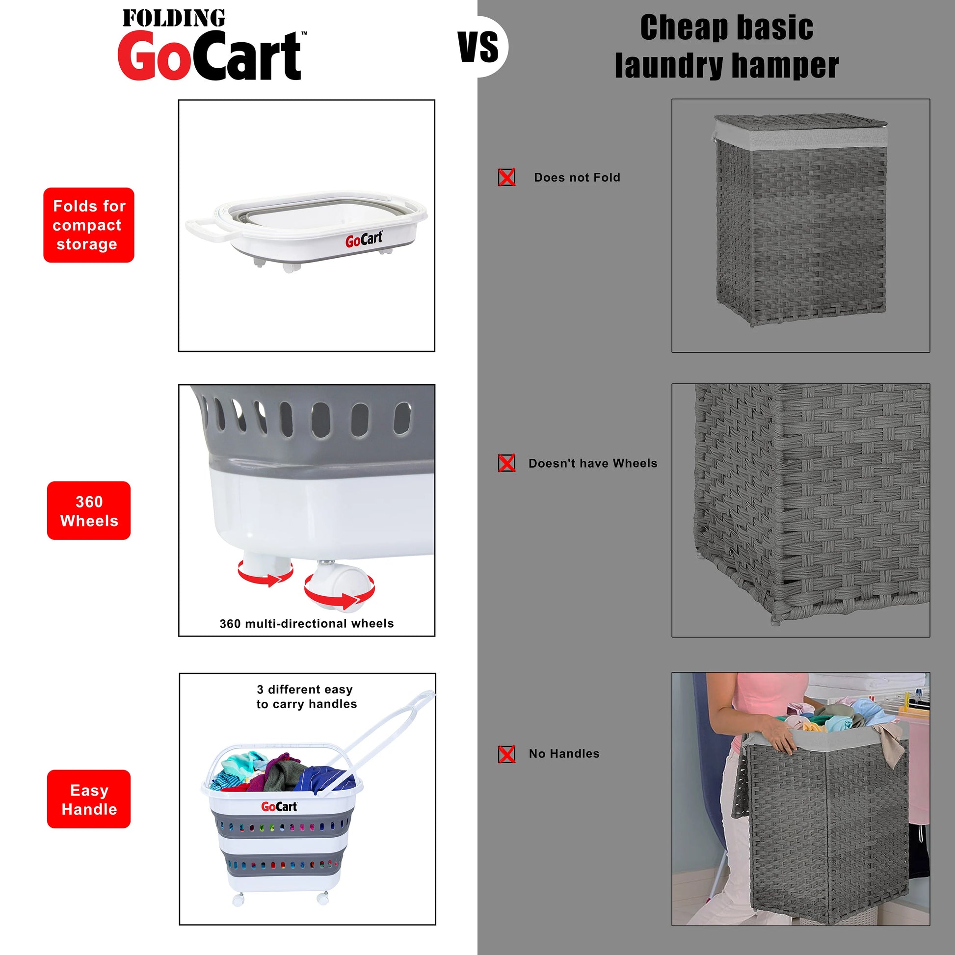 The Folding GoCart is the perfect cart for all your needs both inside and outside the house. Roll it with the telescoping aluminum handle or carry it with the top handle. You can also pick it up anywhere with the rim handle. Use it for grocery laundry cleaning supplies and more. The tire tread allows you to pull more weight with less effort. Carry all your dirty clothes with lightweight rolling laundry basket.