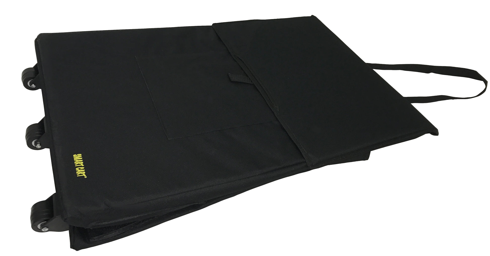 The Jumbo Smart Cart has more space than any other traditional cart. It is an easy to use and convenient collapsible rolling cart with extremely large carrying capacity. The high quality ball bearing wheel mechanism produces smooth gliding and unmatched maneuverability. It's patented ergonomically designed, extendable aluminum handle with a non-slip rubber grip that allows you to pull more weight with less effort reducing the stress on one’s shoulder, neck, wrists, and back. The Jumbo Smart Cart has a convenient front pocket and a side mesh pocket. Its weight capacity is 125 pounds, more than the load capacity of any other soft-sided cart on the market and folds to just 2-inch for easy storage. It helps the environment as it avoids using disposable bags or boxes. It is made out of durable waterproof material. The Jumbo Smart Cart is available in Black, Blue, and Red.