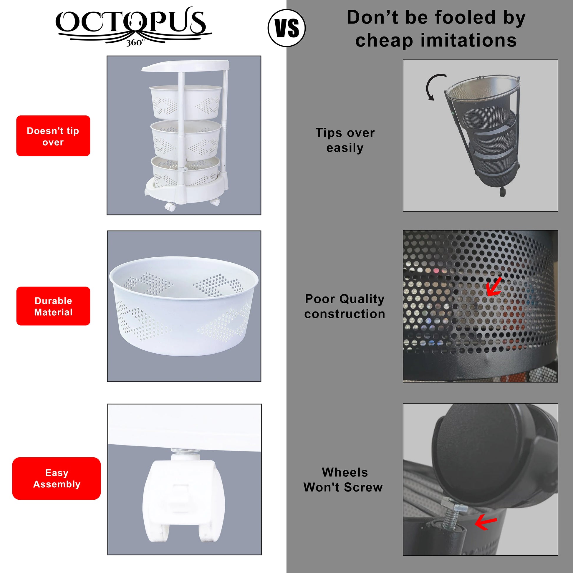 Octopus 360 3 Tier Rolling Cart Kitchen Organization Plastic Rotating Fruit Basket Teacher Classroom Supplies Organizer Makeup Storage Hair Salon Trolley Swivel Lockable Wheels Bar