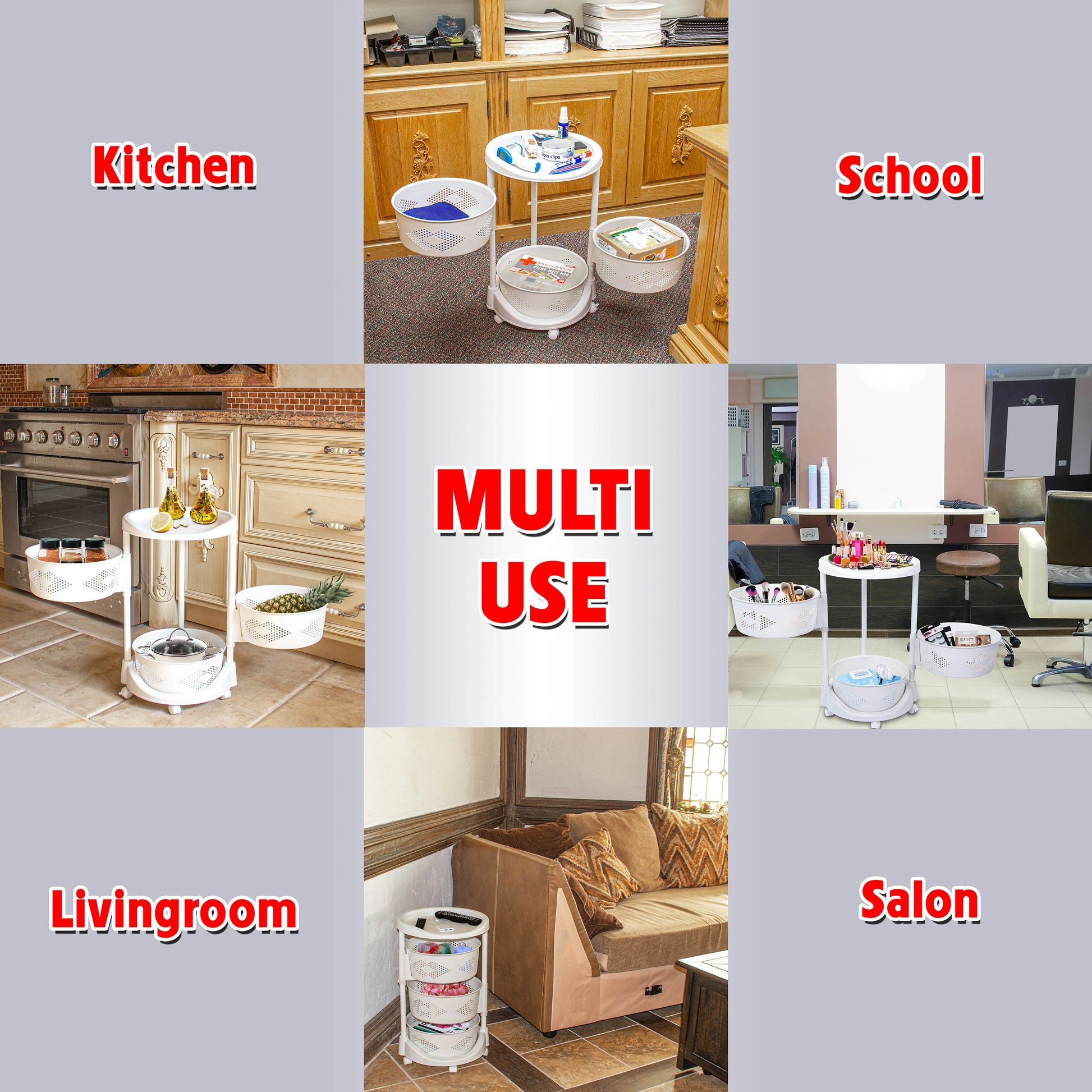 Octopus 360 3 Tier Rolling Cart is the newest cart brought to you by dbest products makers of the Trolley Dolly, the Smart Cart, the Gocart, and the Quik Cart. Made of high-quality polypropylene with removable baskets that sit on rotating shelves for easy access. Includes 5 swivel wheels with the two back wheels having brakes to prevent your cart from moving. This product is key for kitchen organization and storage, Store pantry items like seasonings, condiments, oils, and vinegars. A Teacher's go-to choice when choosing rolling carts with wheels for the classroom. Multi-purpose uses, use it as a Kitchen cart, bar cart, rolling storage cart, Laundry Cart, craft cart, bathroom cart, living room cart, book cart, coffee cart, tool cart, and cleaning cart. |