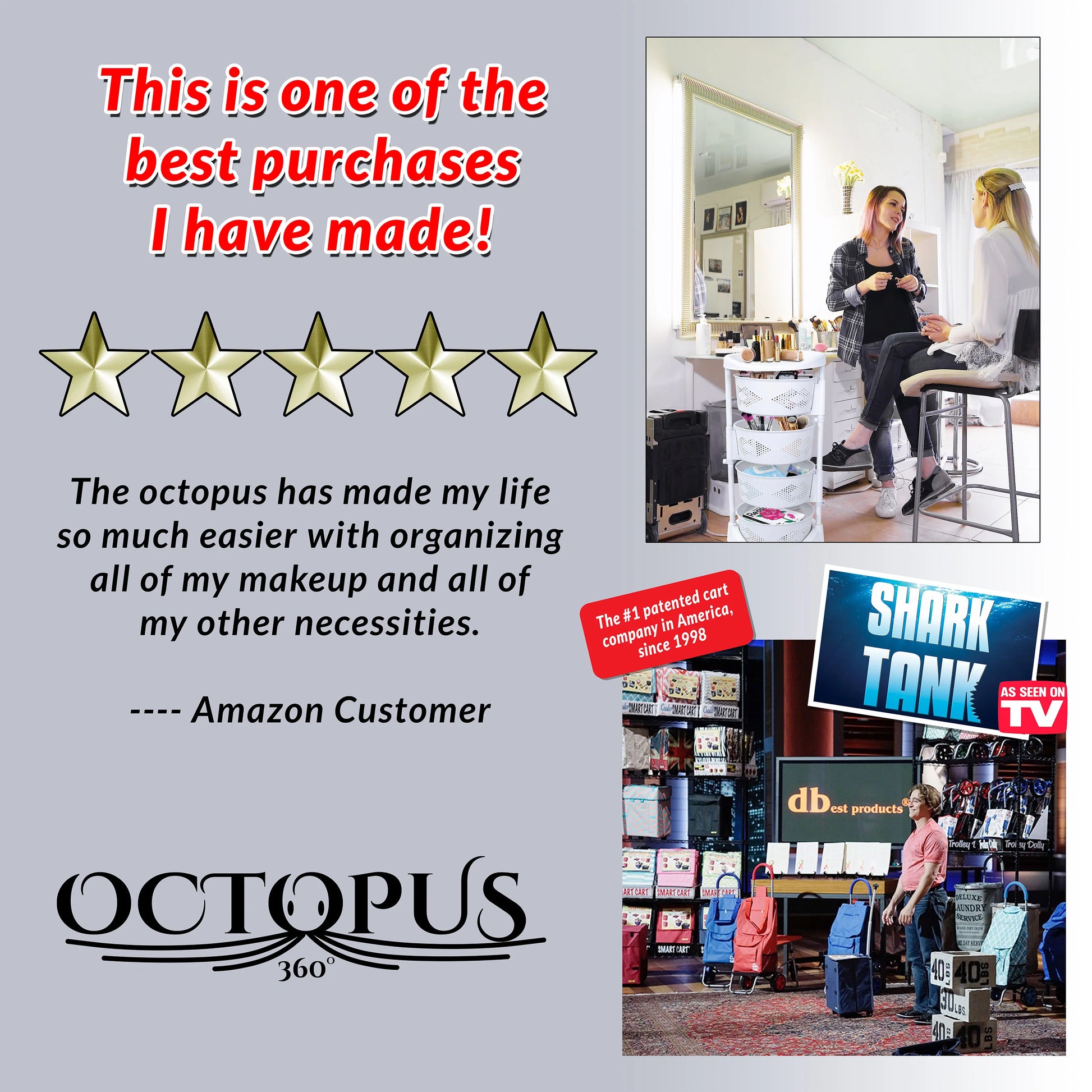 Octopus 360 4 Tier Rolling Cart is the newest cart brought to you by dbest products makers of the Trolley Dolly, the Smart Cart, the Gocart, and the Quik Cart. Made of high-quality polypropylene with removable baskets that sit on rotating shelves for easy access. Includes 5 swivel wheels with the two back wheels having brakes to prevent your cart from moving. This product is key for kitchen organization and storage, Store pantry items like seasonings, condiments, oils, and vinegars. A Teacher's go-to choice when choosing rolling carts with wheels for the classroom. Multi-purpose uses, use it as a Kitchen cart, bar cart, rolling storage cart, Laundry Cart, craft cart, bathroom cart, living room cart, book cart, coffee cart, tool cart, and cleaning cart. |
