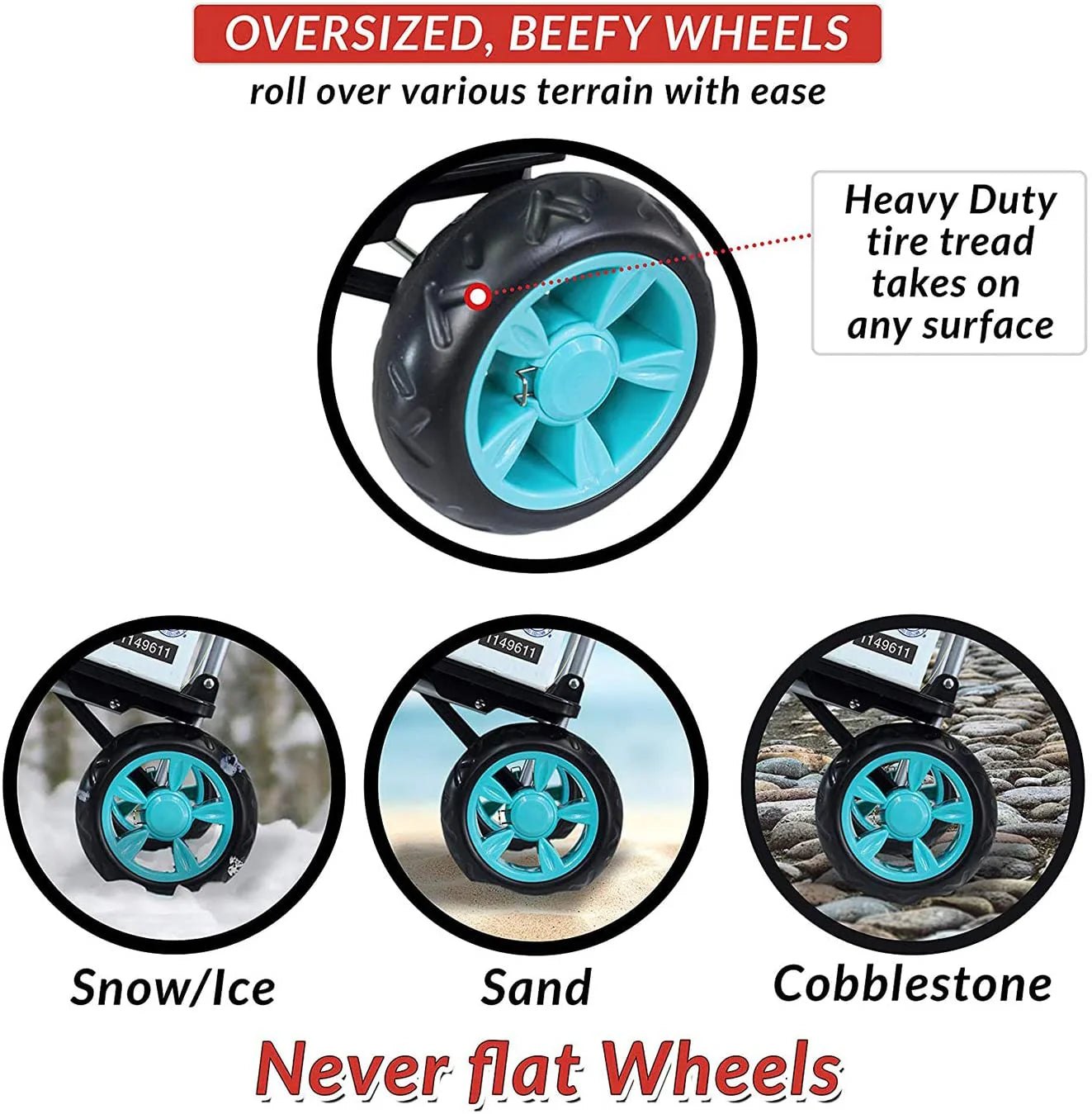 Light and durable: Our folding trolley dolly cart perfectly balances lightweight capability with durability and features oversized, heavy duty beefy wheels to take on various terrain; Take it to the supermarket or the beach; Climb broken and high curbs and sidewalks with ease.