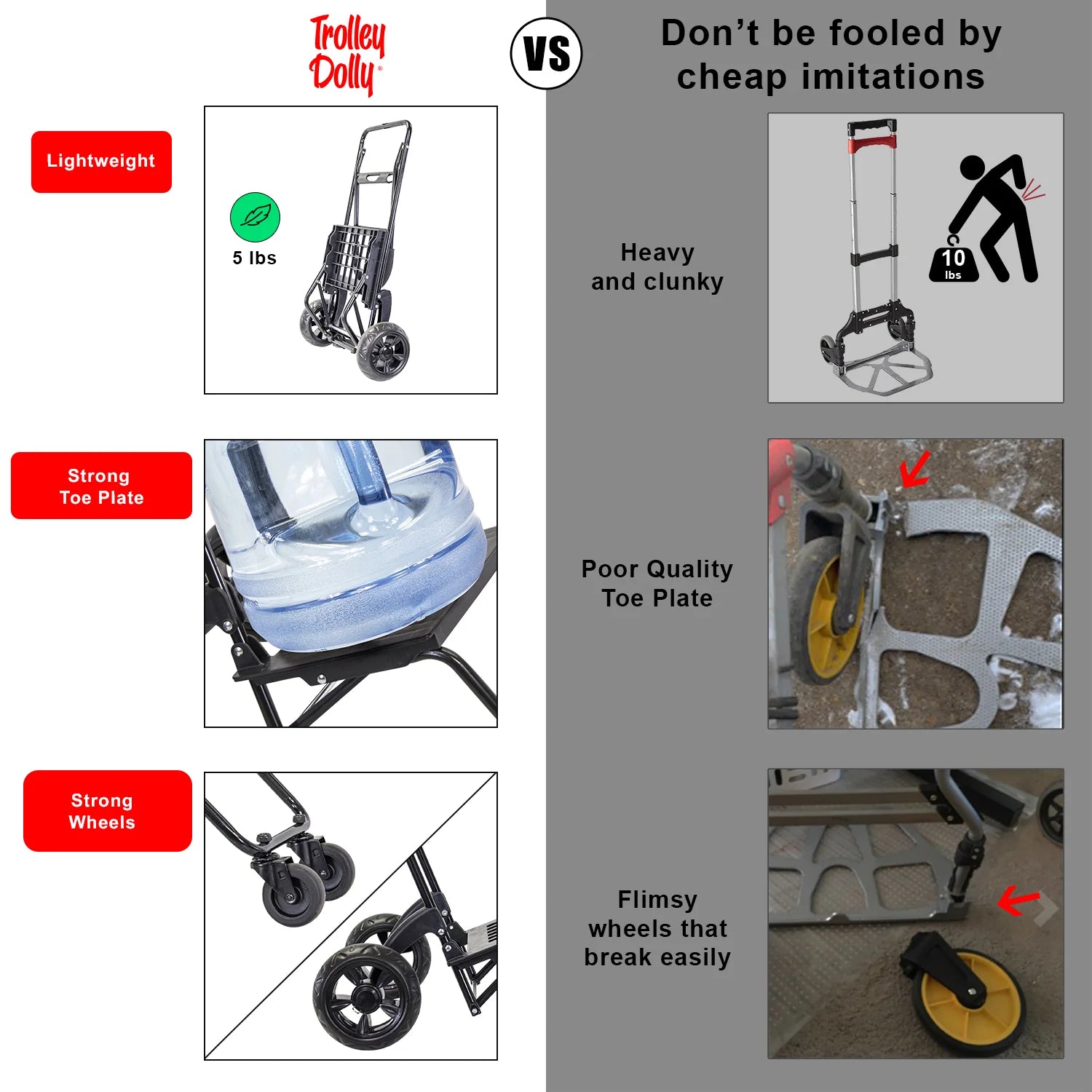 Trolley Dolly Rover is the newest cart brought to you by dbest products makers of the Trolley Dolly, the Smart Cart , the Gocart and the Quik Cart. Folds in 1/2 for compact storage. It is equipped with a bigger toe plate to help transport larger items wih ease. It has a comfort cushion handle that allows you to pull it anywhere. The oversized beefy wheels allow for smooth rolling on any surface, including cobblestones, sand, stairs or any uneven surfaces.
